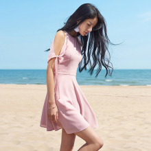 裙纪 新品甜美风粉色雪纺连衣裙露肩系带显瘦中裙气质淑女A字裙