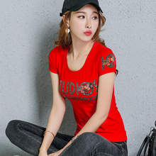 女装T恤 短袖圆领体恤女士印花大码镶钻修身夏装新款韩版上衣半袖