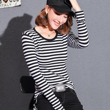 2016秋新款韩范体恤修身黑白条纹长袖女T恤大码女装紧身打底衫潮