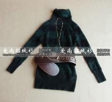 2015爆款中长款条纹貂绒衫黑驼色堆领女式针织裙撞色长貂绒毛衣