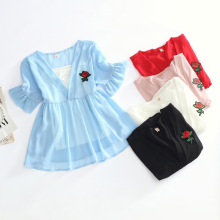 2017夏季新款韩版V领女衬衫中长款宽松雪纺衫两件套短袖领带上衣