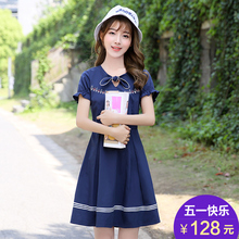 韩舍艳2017韩版中长款少女连衣裙初高中学生海军风条纹拼接裙子