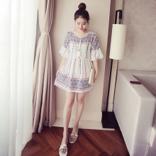 2017夏季圆领系带五分喇叭袖民族风印花连衣裙女大码宽松短裙