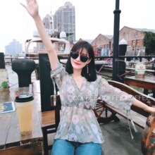 youhuo168诱惑168V领荷叶边七分袖宽松百搭碎花雪纺衫上衣女8813