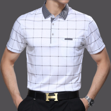 2017夏季中年男士短袖t恤翻领薄款体恤衫爸爸装双丝光棉格子T恤男