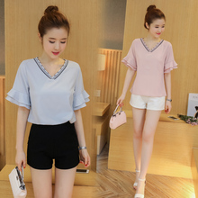 2017夏装韩版新款时尚镶钻短袖V领纯色修身百搭雪纺衫上衣服潮女6