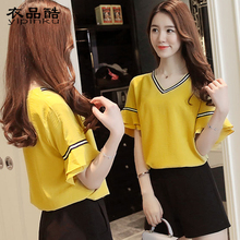 春装2017夏季新款韩版V领T恤女百搭时尚打底衫雪纺衫短袖上衣服潮