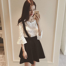 2017春装新款性感蕾丝修身上衣+减龄百搭背带半身裙子时尚套装女