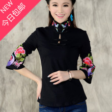 云南民族风 复古绣花 时尚小立领 盘扣 修身 棉T恤 长袖大码女T