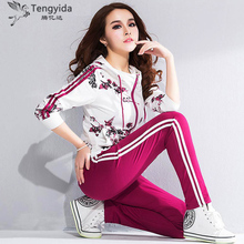 秋冬花鸟印花民族风运动休闲套装女修身显瘦跑步服两件套薄款卫衣