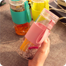 韩版情侣个性头像创意玻璃水杯 硅胶便携手拎带盖防滑耐热茶杯子