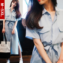 加肥加大码夏装文艺范衬衫式连衣裙胖mm收腰显瘦休闲中长款连衣裙
