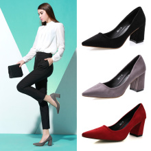 单鞋女2017春夏欧美尖头粗跟绒面女鞋浅口黑色工作鞋ol通勤高跟鞋