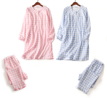 格子条纹 全纯棉双层纱布长袖产妇睡衣 纱布春夏透气月子服套装