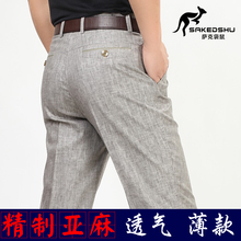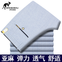 萨克袋鼠夏季薄款亚麻休闲裤男士中年修身弹力棉麻男裤子免烫长裤