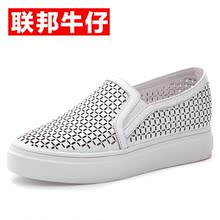 联邦牛仔2017春季新款真皮女鞋时尚韩版内增高休闲单鞋星星镂空款