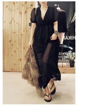 大码女装新款夏季欧美范V领雪纺短袖连衣性感拖地沙滩长裙特价