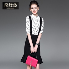 隆缘裳2017春夏季新款波点衬衫修身背带连衣裙子时尚套装裙女2159