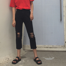 韩国ulzzang夏季港味原宿风高腰膝盖破洞七分九分阔腿裤牛仔裤女