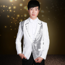 新款亮片西服男士韩版白色礼服 大合唱演出服主持人歌手舞台服装