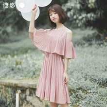 2017韩版夏季新款纯色露肩小清新百褶裙学院风宽松荷叶边连衣裙女