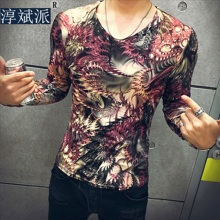 秋冬个性印花V领花T恤男士长袖体恤青年韩版修身T打底衫男衣服潮