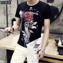夏季玫瑰花印花T恤男圆领短袖青年韩版修身半袖打底衫潮流花体恤