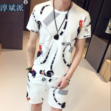 夏季男装花纹短袖套装男修身T恤套装运动套装夏天衣服男潮流短裤