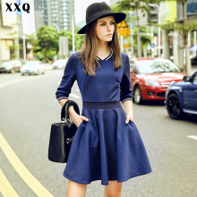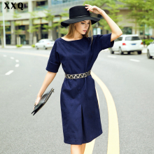 XXQ2017春通勤衬式单排扣牛仔连衣裙夏收腰七分袖修身a字裙打底裙