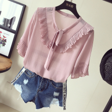 雪纺衫女白色短袖2017夏装新款小清新纯色百褶荷叶领衬衫雪纺上衣