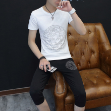 2017夏季短袖T恤套装男韩版休闲运动套装青年发型师潮流修身7分裤