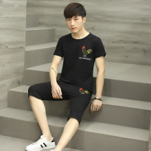 夏季男士休闲运动套装2017新款绣花短袖T恤两件套夏天韩版七分裤