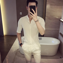2017春夏新款英伦男装七分袖衬衫套装商务绅士韩版修身纯色男衬衣