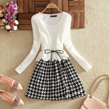 2017春装新款女装韩版通勤修身显瘦A字裙长袖千鸟格假两件连衣裙