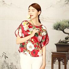 沃斯淇2017新款真丝中年女装夏季上衣时尚圆领丝绸印花桑蚕丝t恤