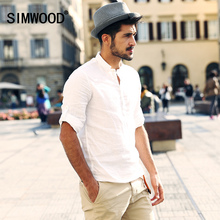 Simwood简木男装新款休闲男士修身亚麻短袖衬衫男潮纯白色衬衫男