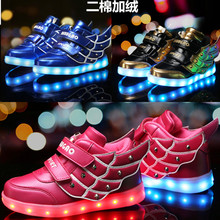 秋冬儿童发光鞋二棉闪光翅膀男童运动鞋闪灯童鞋usb充电高帮灯鞋