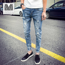 夏季新款九分裤男青少年牛仔裤男小脚裤抵挡跨裤男士微跨潮哈伦裤