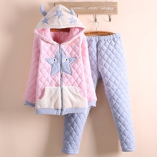 加厚卡通可爱贝贝绒夹棉睡衣少女学生连帽中长款夹棉家居服套装冬