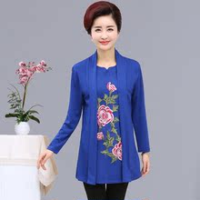 中老年人女装秋装绣花假两件 奶奶装夏装长袖T恤妈妈装上衣婆婆装