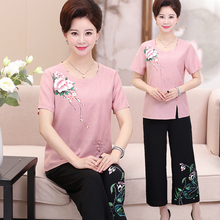 中老年人女装套装短袖阔腿裤40夏妈妈装大码t恤衫服装两件套棉麻