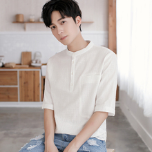 夏季亚麻男士衬衫短袖宽松棉麻韩版中袖小清新5五分袖上衣衬衣潮