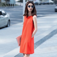 Amii[极简主义]夏款无袖背心裙大码纯色后背V领连衣裙短裙女