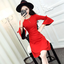 2016秋装新款韩版气质名媛性感露脐时尚圆领喇叭袖修身包臀连衣裙