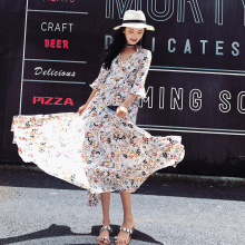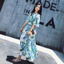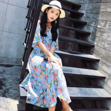 2017夏季新款女装气质长款雪纺连衣裙复古印花度假沙滩长裙仙女裙