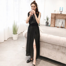 2017夏装新款韩版女装修身显瘦雪纺长裙无袖镂空开叉长款连衣裙潮