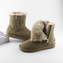 包邮冬季新款侧拉链雪地靴女中筒靴子真皮羊毛一体平底棉鞋卡其色