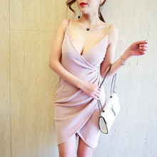 苗苗家气质女性感V领合金吊带褶皱收腰显瘦不规则包臀连衣裙3022