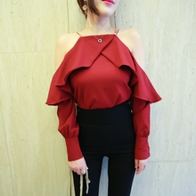 泰国潮牌开叉荷叶边长袖性感吊带露肩显瘦气质女人味上衣小衫5019