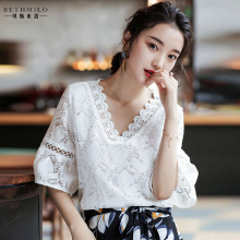 2017夏装新款韩版性感V领五分袖立体钩花水溶蕾丝衫显瘦上衣T恤衫